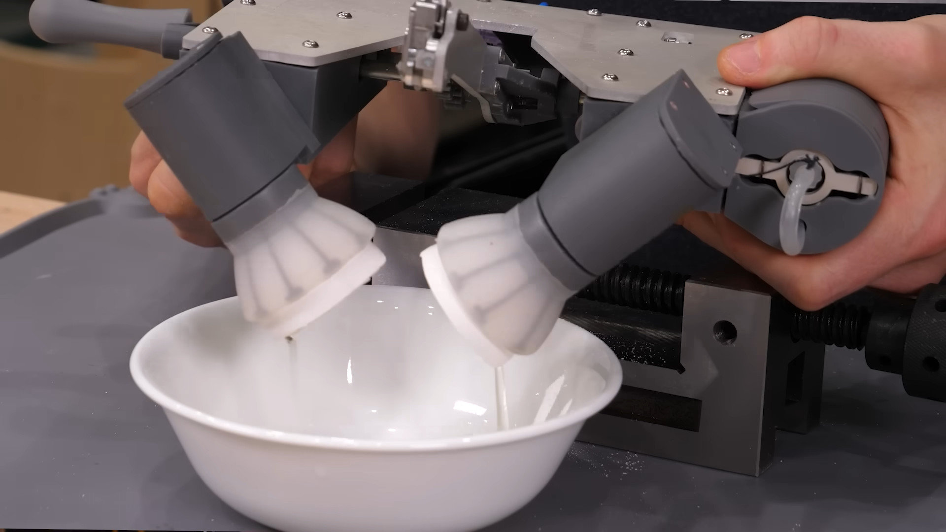 The machine works on the principle of scoring a line along an egg shell to weaken it, then gently tapping it to fracture the shell. A simple theory that proved complex to build into a machine. The first challenge was merely holding an egg as eggs come in all shapes and sizes. [Stuff Made Here] ended up settling on silicone over-molded with a 3D printed structure. After numerous prototypes, this evolved into including over-molded arms for added stiffness, and a vacuum seal for added rigidity.