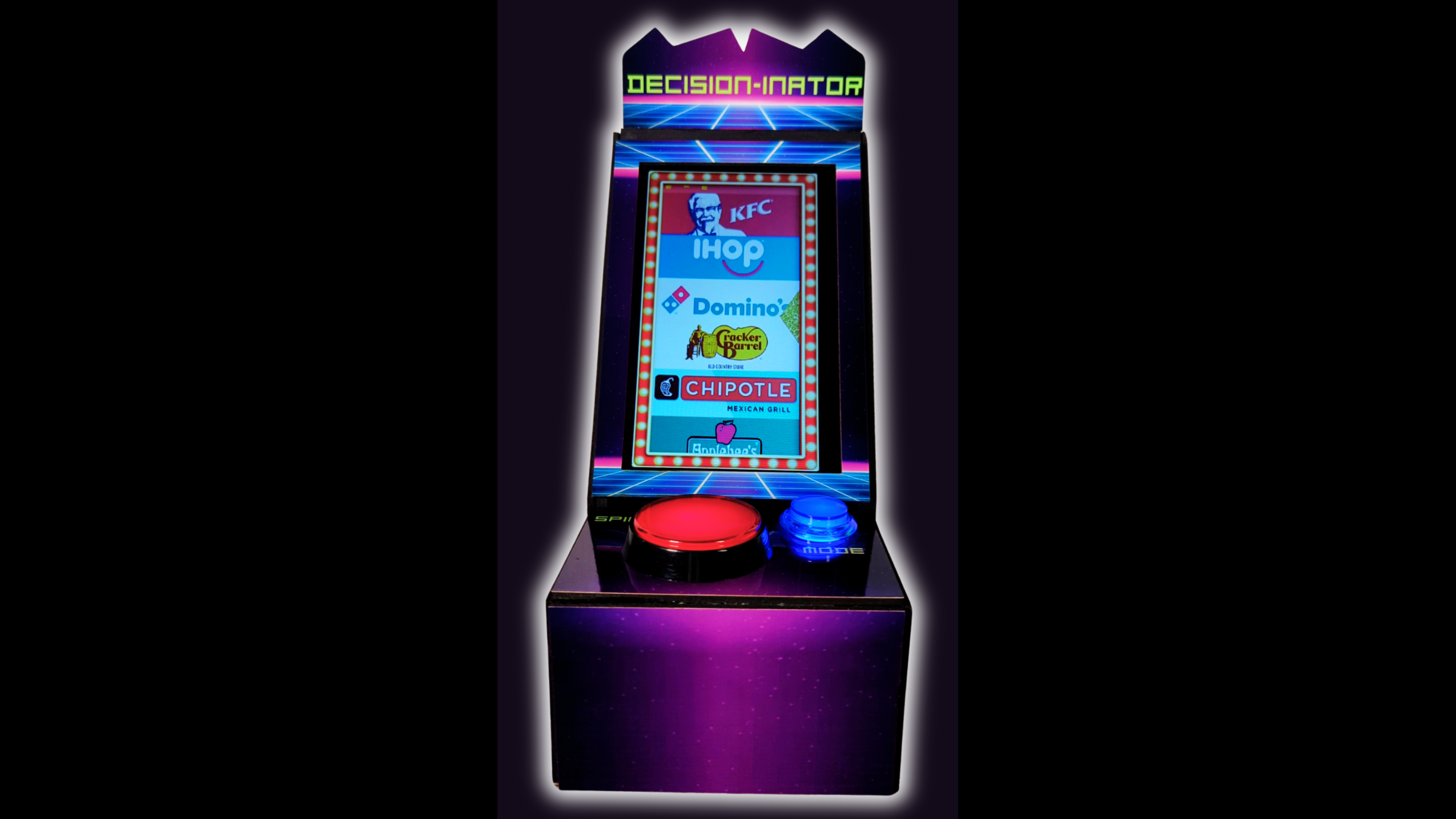 In form factor, it’s a tiny slot machine which [Makerinator] fabbed up on his laser cutter. The lovely “paintjob” was actually a print out with dye-sublimation ink that was transferred to plywood before laser cutting. Mounted to this are illuminated arcade buttons and a small ISP display. The interface is simplicity itself: the big button spins a virtual “wheel” on the display (with sound effects inspired by The Price is Right) to tell the family what deliciously unhealthy slop they’ll be consuming, while the other button changes decision modes. Of course you can pick more than just dinner with The Decisioninator. You need only decide what spinners to program. Which, uh, that might be a problem.