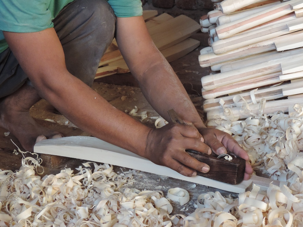 An Indian craftsman hand-shaping a cricket bat.