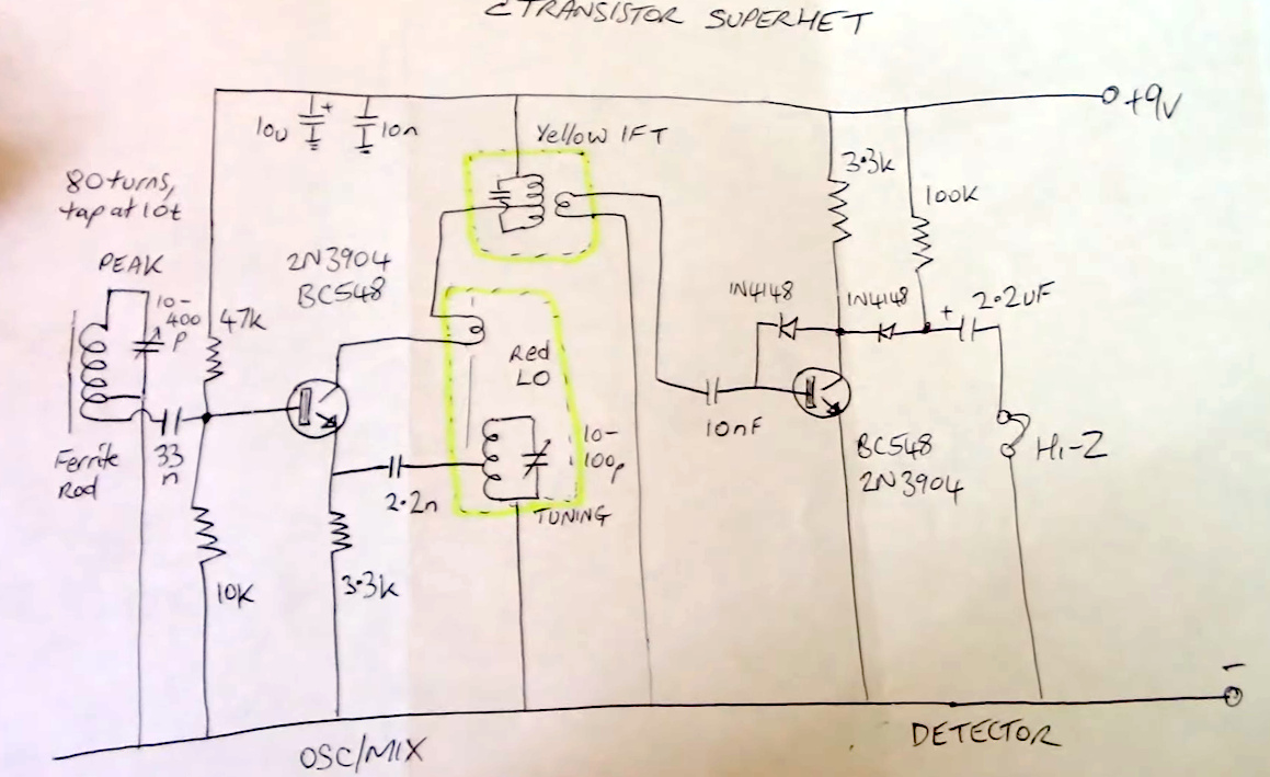 A modern portable radio will almost certainly use an all-in-one SDR-based chip, but in the golden age of the transistor radio the first stage of the receiver would be a single transistor that was simultaneously RF amplifier, oscillator, and mixer. The circuit in the video below does this , with a ferrite rod, the familiar red-cored oscillator coil, and a yellow-cored IF transformer filtering out the 455 kHz mixer product between oscillator and signal.