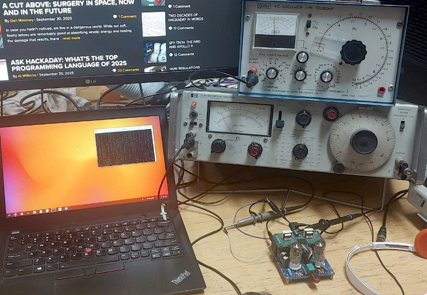 Having explained what we are trying to do, it’s on to the device in question and the instruments required. On the bench in front of me I have my tube headphone amplifier project, a Chinese 6J1 preamp kit modified with transformers on its output for impedance matching. I’ve investigated the unmodified version of this kit here in the past, and measured a THD of 0.03% when it’s not driven into distortion, quite an acceptable figure.