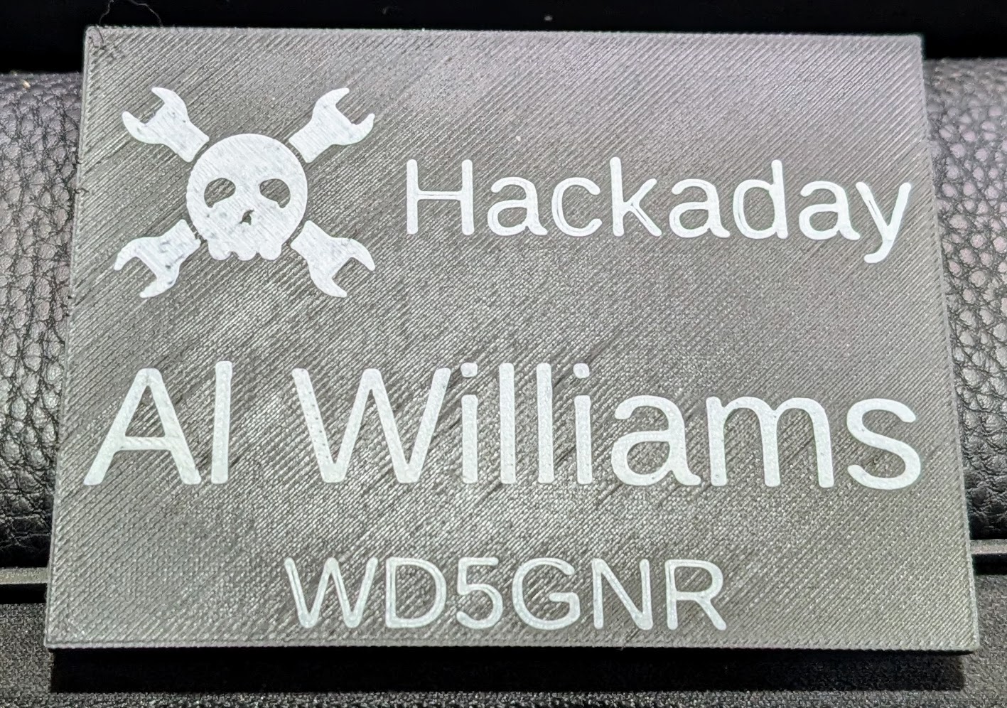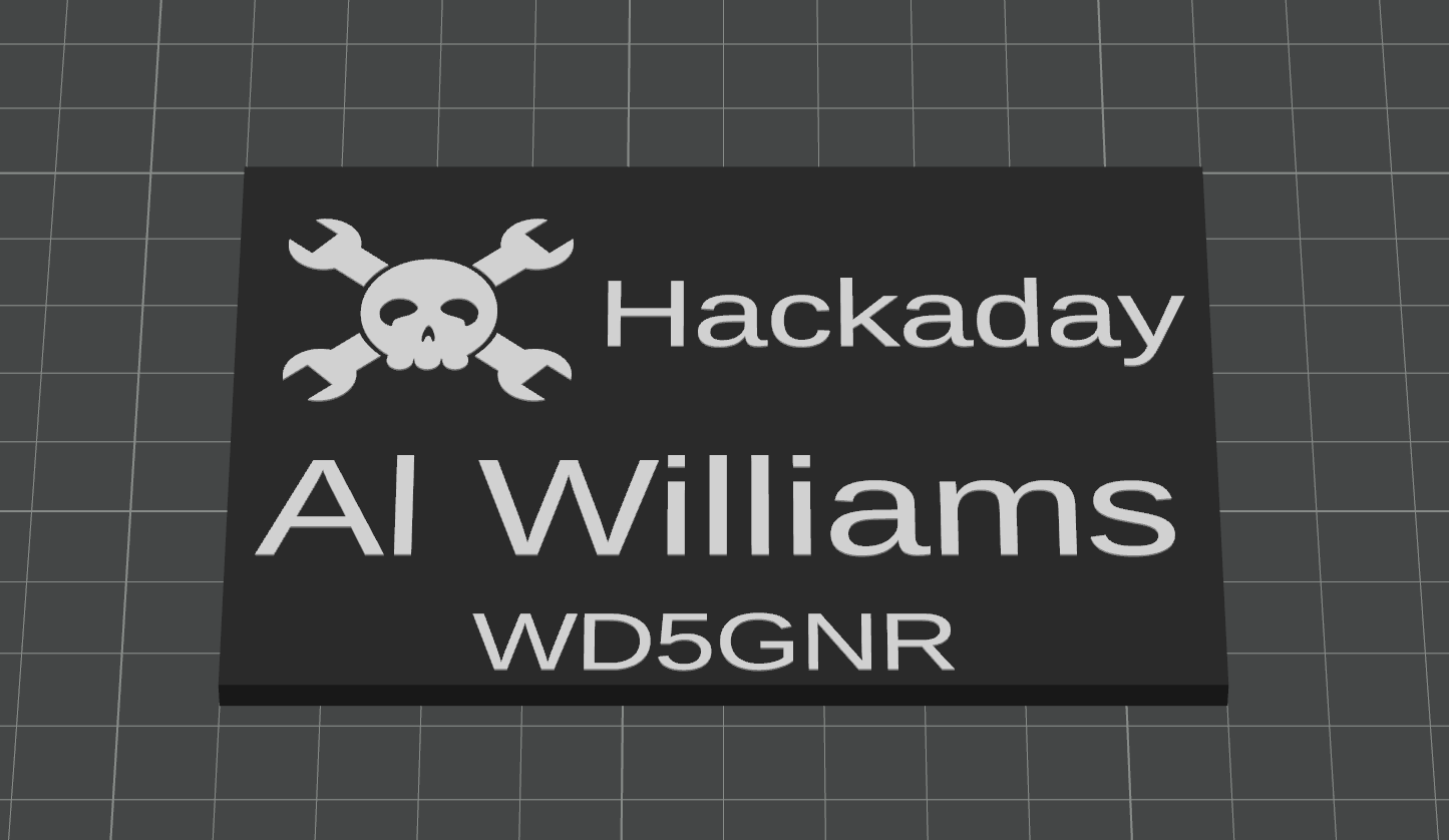 Since Supercon is coming up, I decided I wanted a “hello” badge that wouldn’t run out of batteries like my last one. It was easy enough to make a big plastic plate in OpenSCAD, import a Jolly Wrencher, and then put some text in, too.