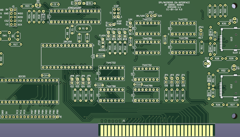 Back when the IBM PC was new, laying out an ISA board was a daunting task. You probably didn’t have a very fast ‘scope, if you had one at all. Board layout was almost certainly done on a drafting table with big pieces of tape. It was hard for small companies, much less hobbyists, to make a new card. You could buy a prototype board and wirewrap or otherwise put together something, but that was also not for the faint of heart. But with modern tools, something like that is a very doable project and [profdc9] has, in fact, done it. The card uses an ATMega328P and provides two SD cards for use as mass storage on an old computer.