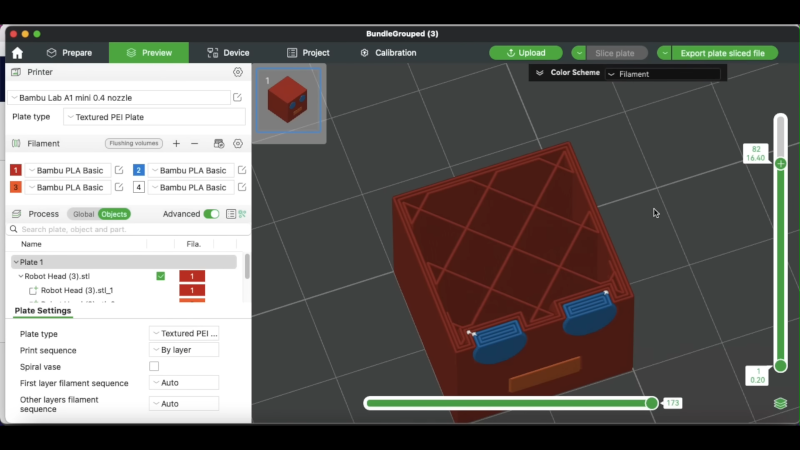 [CHEP] uses a made-up example of a robot head. In reality, rotating it would have made printing much easier, but it does show his point. We might have grouped the eyes, but maybe you want a robot with heterochromia. Also, if your projects get complex, you might not appreciate the part names being things like “Robot Head (3).stl_3.” No worries. You can click on the name and rename it in the slicer.