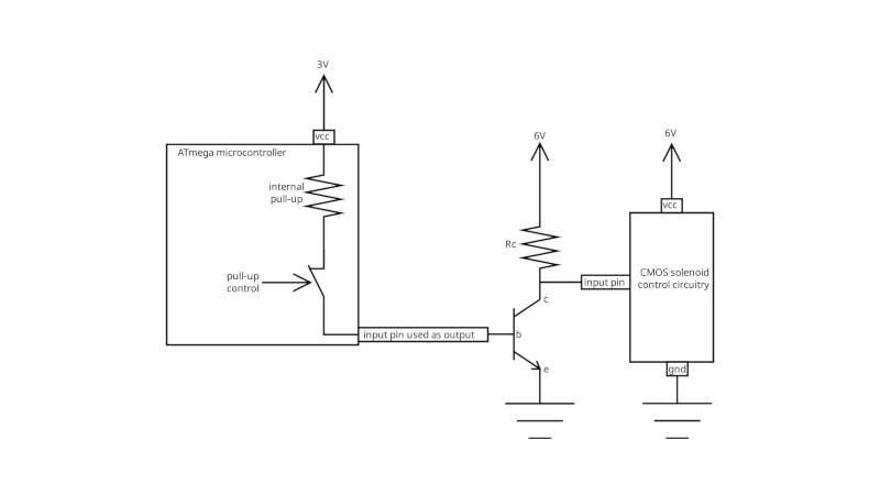 The whole thing takes advantage of the internal pull-up resistor that a microcontroller has among its internal kit of parts. Driving a transistor from an output pin usually requires a base resistor, so would it be possible to use the pullup as a base resistor? If the microcontroller can enable or disable the resistor on an input pin then yes it can, a transistor can be turned off and on with nary an output to be seen. In this case the chip is from ATmega parts bin so we’re not sure if the trick is possible on other manufacturers’ devices.