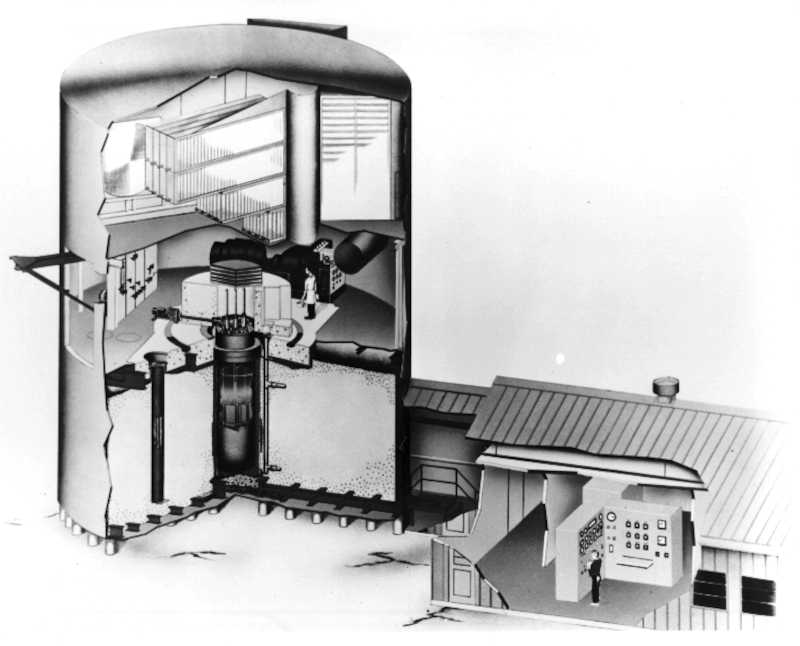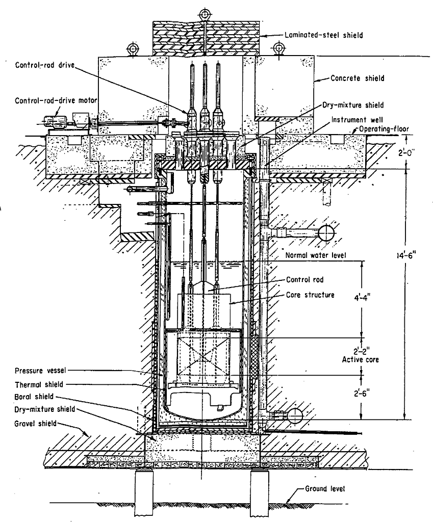The reactor was inside a 48-foot-tall cylinder 38.5 feet in diameter. It was made of quarter-inch plate steel. Because the thing was in the middle of nowhere in Idaho, this was deemed sufficient. There was no containment shell like you’d find on reactors nearer to population centers.
