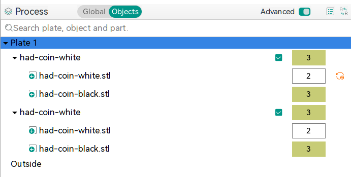 The resulting object won’t look much different until you go to “Process”, on the left-hand side of the screen, and switch from the default Global to Objects. From there, you’ll see the objects and their components. At first, each one will be set to the same color, but by clicking on the color box, you can assign different colors. In the screenshot, you’ll see two identical objects, each with two parts. Each part has a different color. The number is the extruder that holds that color.