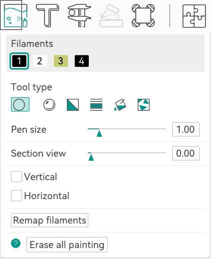 In Orca, you can select an object in the Prepare screen and then use N, or the toolbar, to bring up the paint color dialog. From there, you can pick a brush shape, pen size, and color. Then it is easy to just paint where you like by left-dragging. You can remove paint by pressing Shift while clicking or dragging. Press the little question mark at the bottom left to see other options.