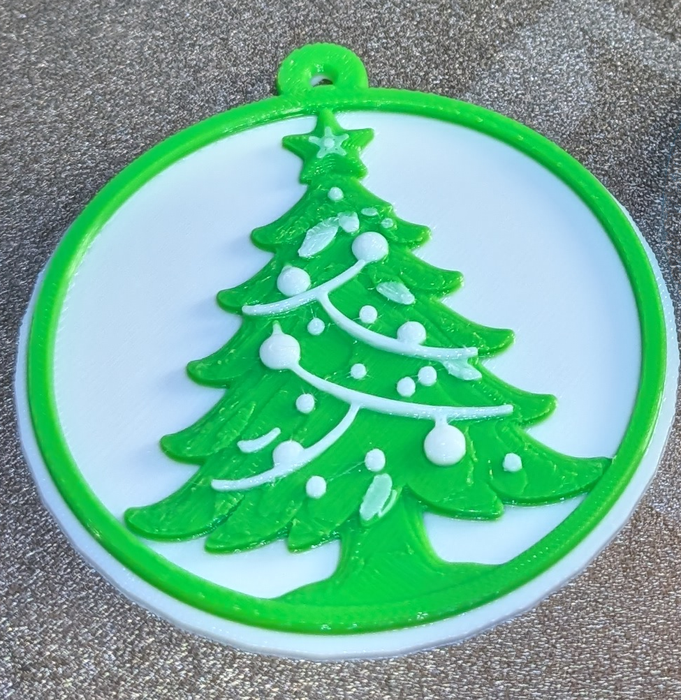 There is another way, though. You can avoid almost all of the waste generation and extra time if your model is designed so that each layer is a single color. People have done this for years, where you put a pause in your G-code and then switch filament manually. The idea is the same but the printer can switch for you. For example, the Christmas Tree ornament uses two filament changes to print white, then green, then white again. This works great for lettering and logos and other simple setups where you simply need some contrast.
