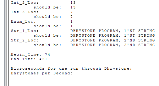 Annoyingly, the printf-lite implementation that I use with Nodate didn’t seem to like the 32-bit float values and were absent in the final output, so I had to do the calculations for the Dhrystones Per Second (DPS) and related MIPS (DPS / 1757) myself. Since the times() implementation’s ticks equal seconds, this was at least fairly easily, giving the following numbers: