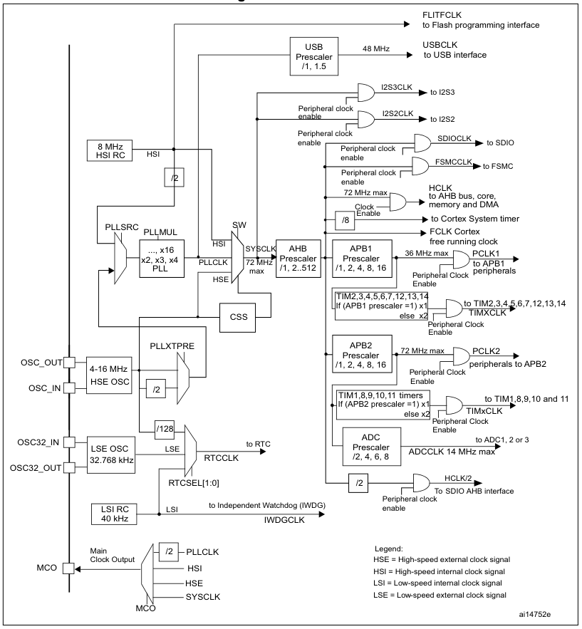 The clock tree of the STM32F10x MCUs. (Source: RM0008)