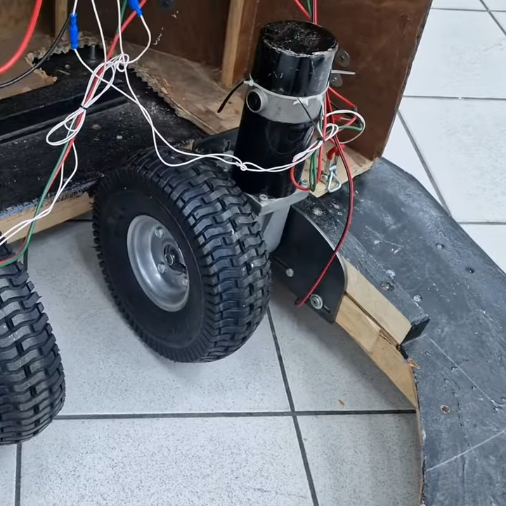 The purchased Dalek is made of wood and, with the help of two bolts, is of sufficient size to trap a human inside. There’s a bench of sorts upon which the captive can sit, and with some effort, shuffle the surrounding frame awkwardly about. The scale of the Dalek is impressive, but it was clear the effect of human-powered locomotion was lacking. The solution was to install wheelchair motors, tires, and an ESP32-based remote control.