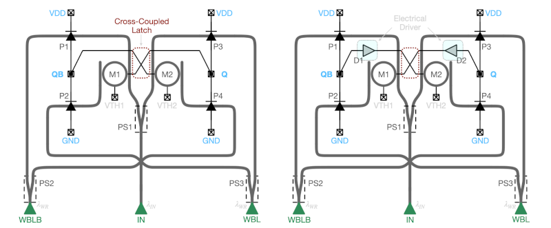 On the device, you’ll find a combination of tiny photodiodes, micro-ring resonators, and optical waveguides. Simulations show the memory element can operate at 20 GHz and might even be readable at 50 or 60 GHz.