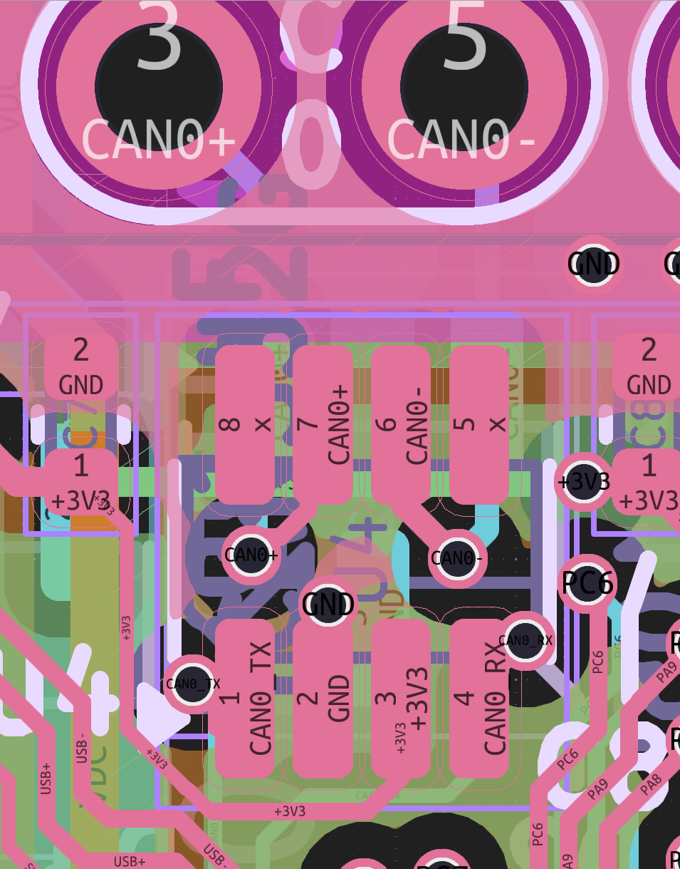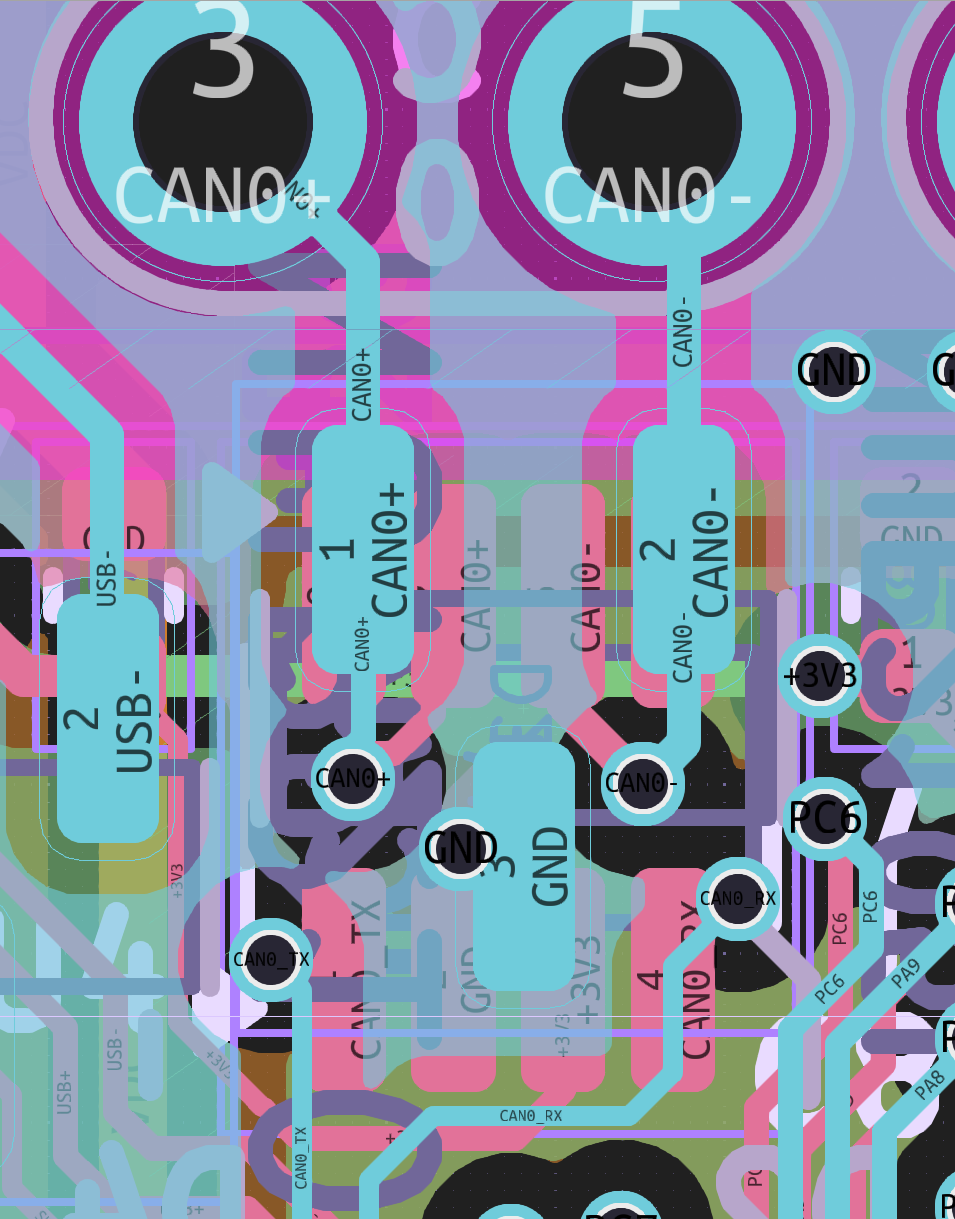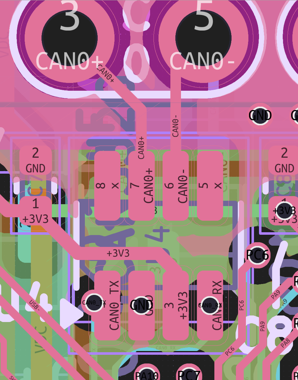 There is but one hiccup with the way they’re placed. ESD diode appnotes will tell you – there’s some extra considerations you can try and put into ESD diode layout. This design pulls connector tracks directly to the CAN ICs on top layer, and directly to diodes on the bottom one. Instead, you should try and route the signal “through” the ESD diodes – letting track inductance play in your favour, and not impeding the ESD diode’s impact.