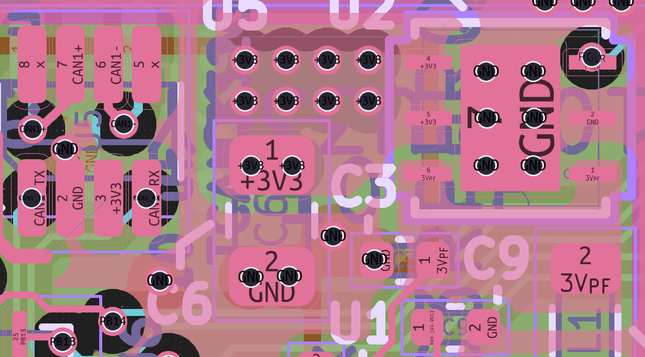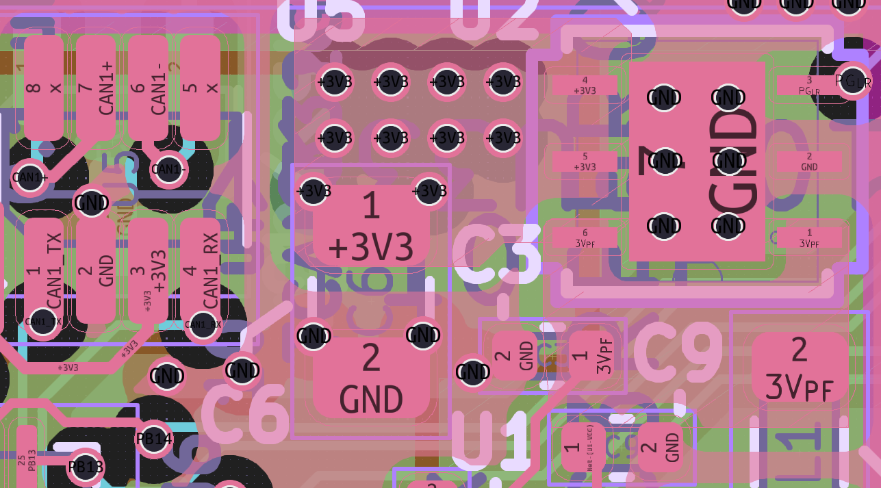 Fortunately, by lightly rerouting 3.3V CAN transceiver power inputs and a few surrounding signals, we can put CAN+ and CAN- signals through vias under the package, so that the signal flows “in series” with ESD diode pads. Similarly, the ESD diodes get vias to ground, shared with transceiver ground vias, but oh well. It’s not perfect, but to my eye, it’s better than before, as far as ESD protection is concerned.