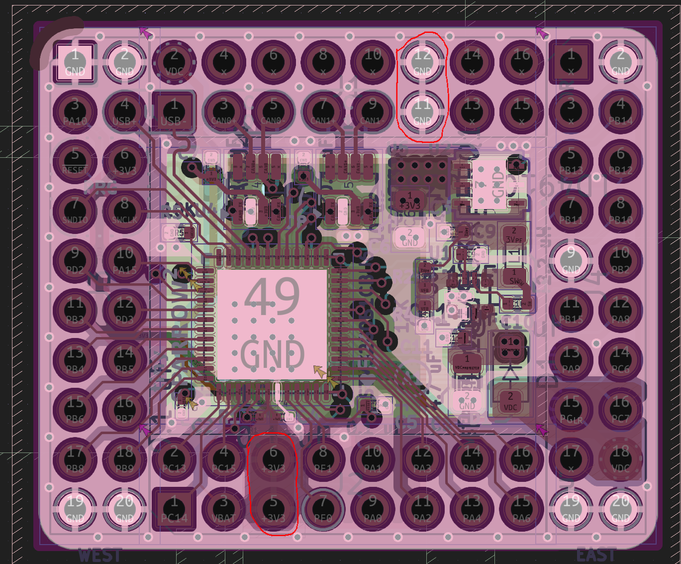 The VDC pin now has GND pins to match, and in general, there’s a lot more GND pins to go around – which is great! It’s pretty surprising to me that the VDC pin is duplicated and its trace goes across the board on an inner layer. This is supposed to be an at least somewhat unfiltered and unprotected car power rail, after all, and I don’t think that’d help things like noise integrity. Maybe this helps with testing because all the core signals are brought to the same corner, but to my eye, it has bad vibes.