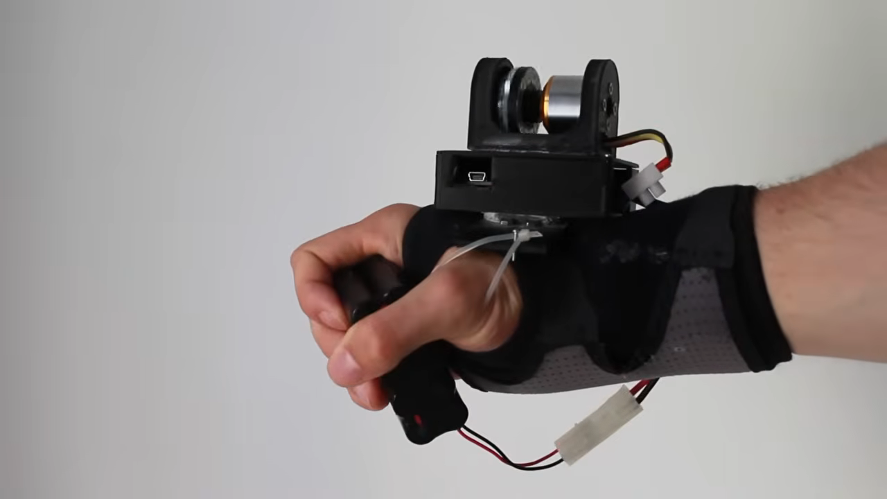 The video covers multiple ideas on how to stabilize a hand suffering involuntary tremors. The first build involved a gyroscope, which proved unsuccessful, but led to the idea of building a reaction wheel. The concept is simple — get the reaction wheel to counteract the forces from tremors to stabilize the hand. To achieve this, an accelerometer was employed to track the movements of the arm and the hand. The magnitude of the movement was then used to control a powerful brushless motor mounted on the wrist. If the tremor was driving a hard tilt to the left, the motor would spin up to create a counter-torque, cancelling out the involuntary movement. This worked to a degree, but the resulting device was large and noisy, which made it impractical.