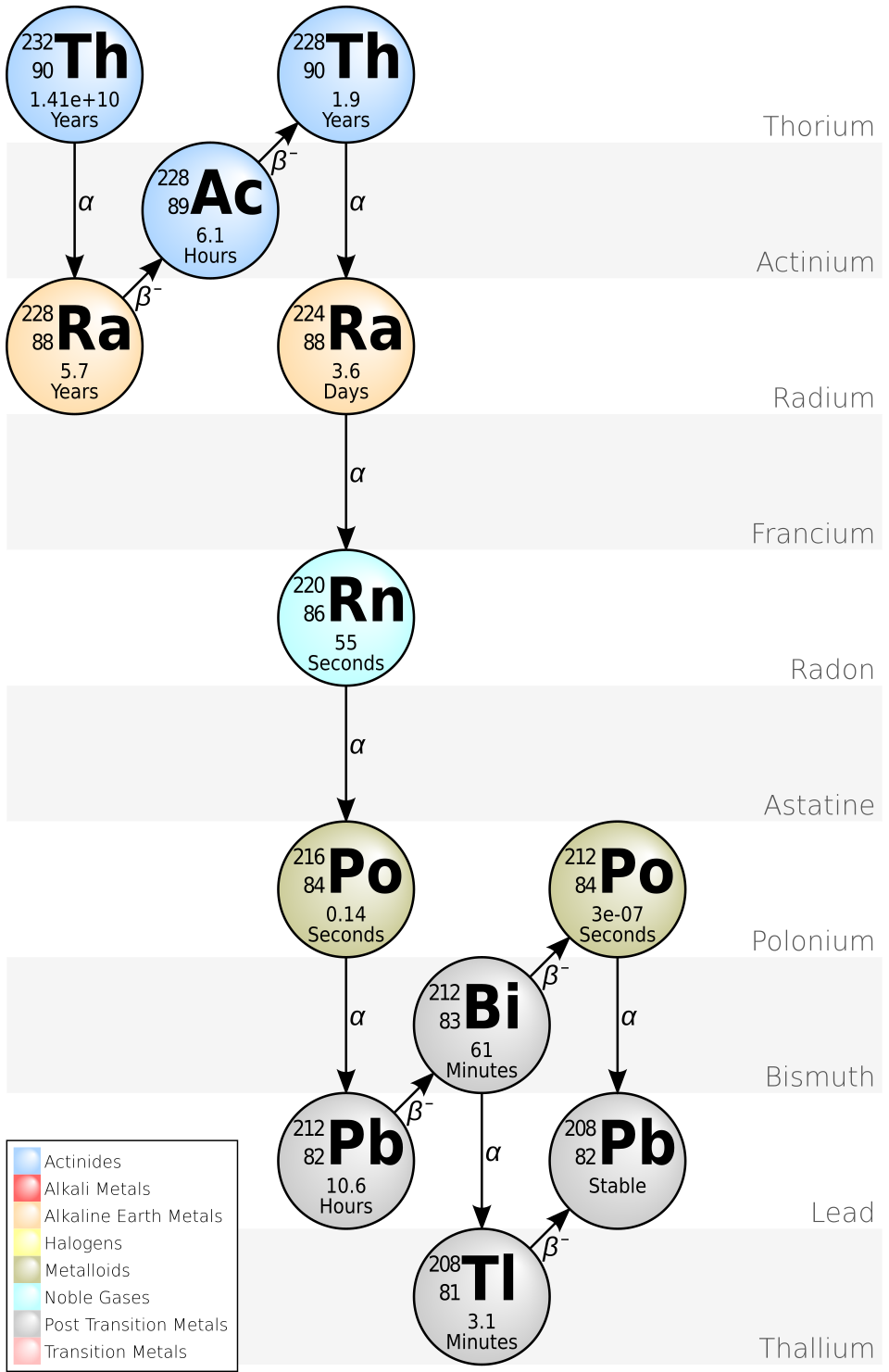 The subsequent decay chain is pretty rapid, taking it through very short-lived isotopes of radon-220, polonium-216 and so on until it becomes stable lead-208. Virtually all of this occurs via alpha decay. Of note is again that the initial isotope here – Th-232 – has a half-life of 14 billion years, or roughly the estimated age of the Universe. This makes it by far the most stable unstable isotope, with U-238 having a half-life of only about 4.463 billion years. Effectively, for most intents and purposes it might as well be a stable isotope.