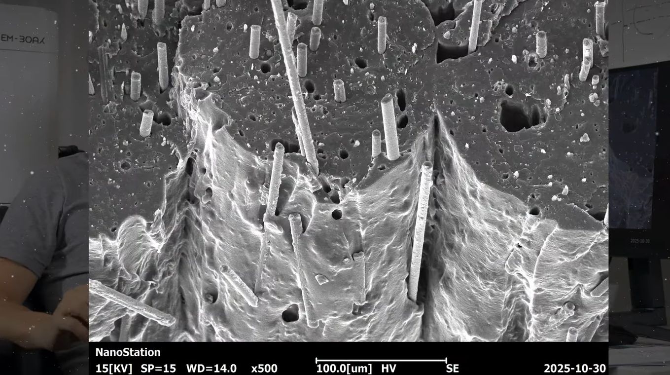 Using the facilities of the University of Basel for its advanced imaging gear, the PLA-CF parts were subjected to both scanning electron microscope (SEM) and Micro CT imaging. The SEM images were performed on parts that were broken apart to see what this revealed about the internal structure. From this, it becomes apparent that the chopped fibers distribute themselves both inside and between the layers, with no significant adherence between the PLA polymer and the CF. There is also evidence for voids created by the presence of the CF.