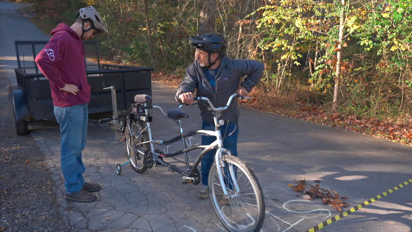 [Seth] decided on a tandem bike for this build. Not only does the second rider add power, but the longer wheelbase makes it less likely that the tongue weight of the trailer will lift the front wheel off the ground. It was modified with a Class 3 trailer hitch, as well as a battery to activate the electric trailer brakes in case of an emergency. But after hooking the trailer up the first time the problems started cropping up. At such a high gear ratio the bike is very slow and hard to keep on a straight line. Some large, custom training wheels were added between the riders to keep it stable, but even then the huge weight still caused problems with the chain and even damaged the bike’s freehub at one point.