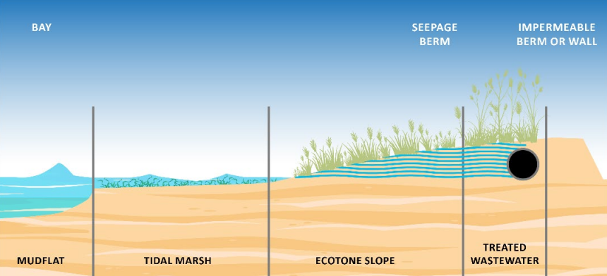 Furthermore, from the top of the horizontal levee, wastewater will be fed in to support the growth of native plants, which will work with the soil to filter out pollutants as it makes its way to the sea in a process referred to as “polishing treatment”. It’s not intended to remove heavy pollutants from the water; this work is handled at existing municipal water treatment facilities. What the levee can handle is soaking up some of the nitrogen and phosphorous content to support plants on the slope. This reduces the amount of these nutrients that gets released out into the bay, which can cause fish die-offs, algal blooms, and other undesirable consequences.