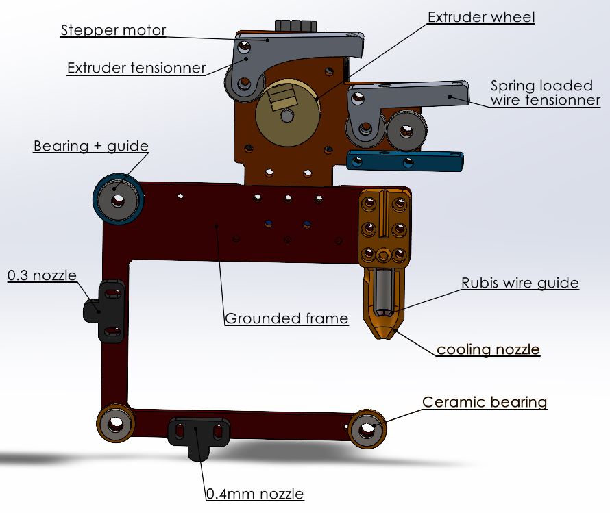 It’s not lost on us how the original RepRap bootstrapping concept could be applied here: a basic frame made externally in a low-cost material, then using the machine to cut a much thicker, stronger copy for its own upgrade. The main guide nozzle is an off-the-shelf ruby part surrounded by a 3D printed water-cooling jacket. To maximise power transfer from the wire into the electrically conductive workpiece material, the top part of the wire feeder, including the wire itself, is one electrode, and the entire bottom part of the frame is electrically isolated from it. The bottom part pulls the ‘consumed’ stock wire through the nozzle above and keeps it under tension, sending it onward to the waste spool.