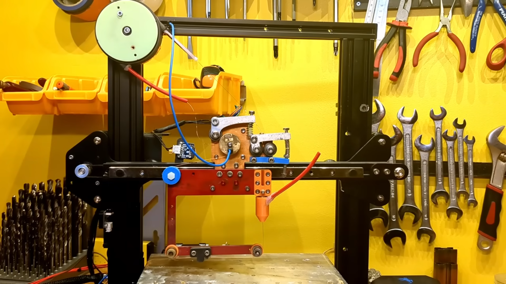 The majority of the work is in the wire feeder assembly, which was constructed around a custom-machined aluminium plate.