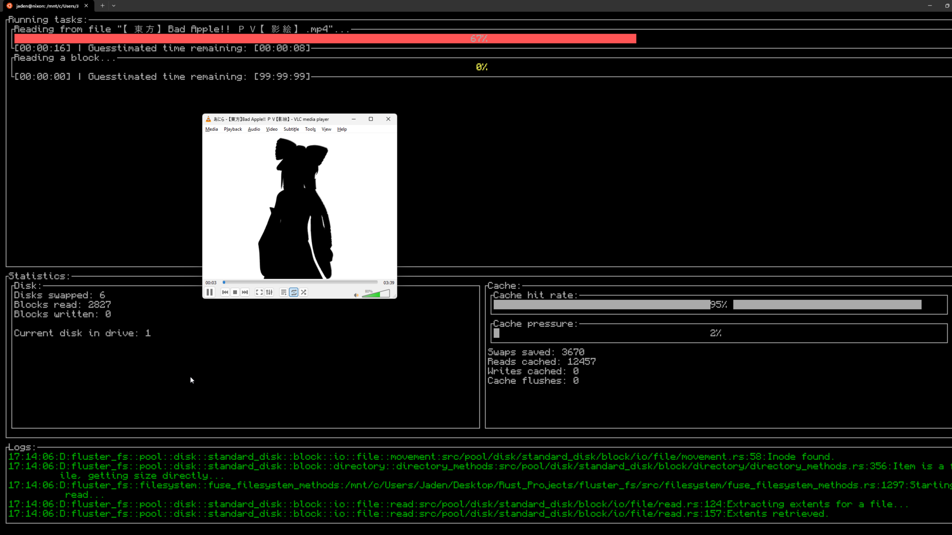 Storing several gigabytes of data on floppy disks is a rather daunting challenge. But instead of using a RAID array, only a single reader and a custom file system is deployed in this setup. A single disk is dedicated to storing pool information allowing for caching of file locations, reducing disk swaps. The file system can also store single files across multiple disks for storage of larger files. Everything mounts in fuse and is loosely POSIX compliment, but lacks some features like permissions and links.