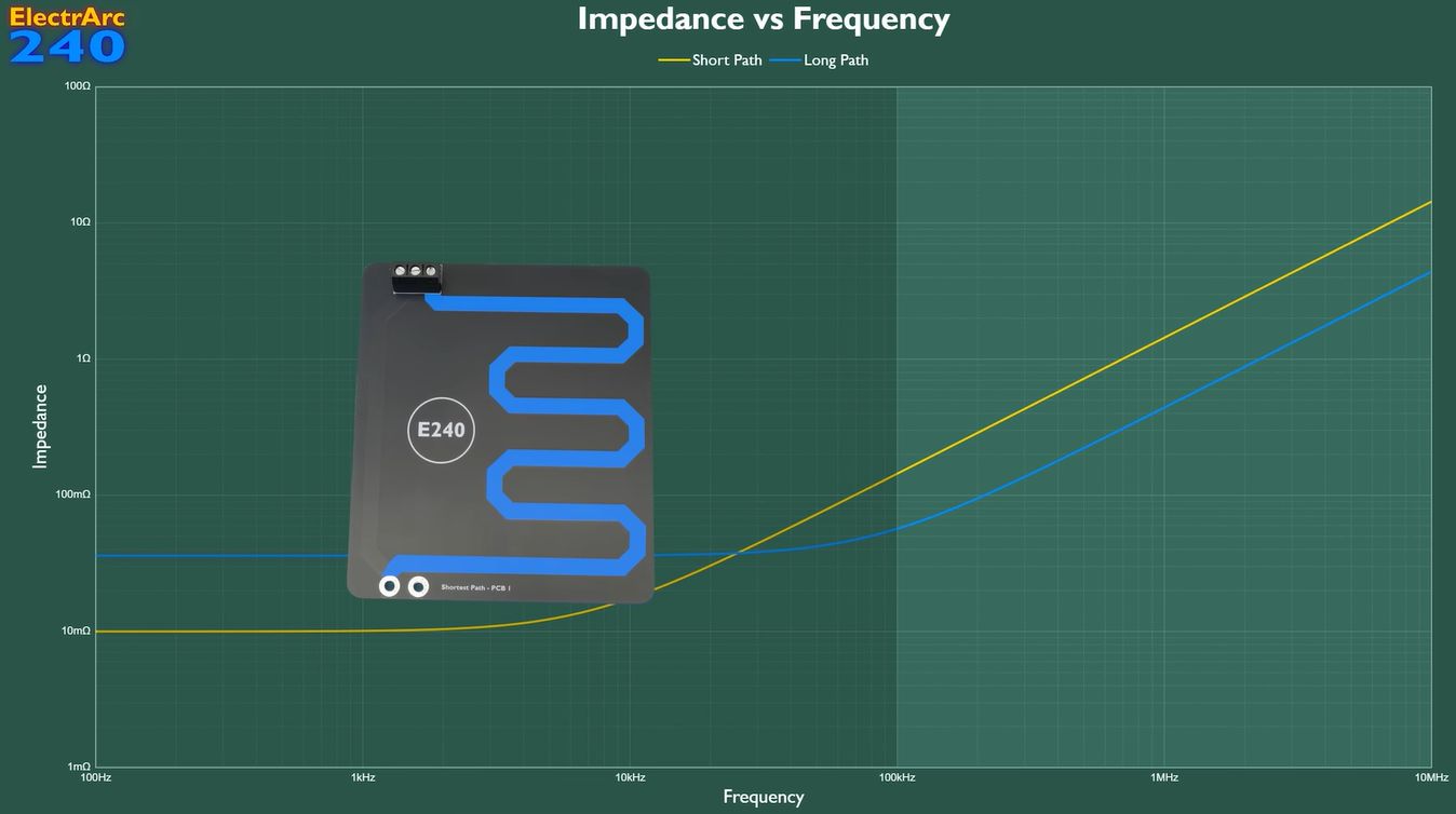 Although for direct current it’s fair to say that impedance is the equivalent of resistance, once the inductance of a trace has to be taken into account – as in the case of AC and high-frequency signaling – the much higher inductance of the short path means that now the long path is actually the shortest.