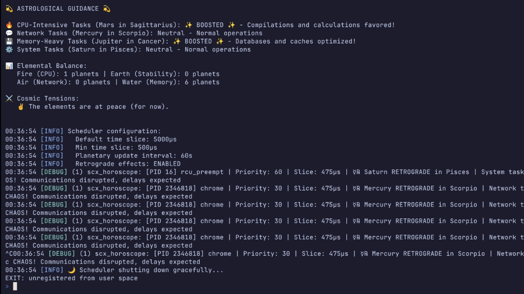 The project is called scx_horoscope, and it’s a sched_Ext scheduler that makes its CPU scheduling choices based on what the heavens are doing in real time. Different tasks are handled based on different astronomical objects. For example, the Sun represents life force, and thus grants boons to key system processes. The Moon, an emotive influence, rules over interactive processes like shells and terminals. Mercury, as the god of communication, handles network and IO tasks, and so it goes from there. It’s not just a surface level thing, either—[Lucas] has implemented the influences of the elements of fire, air, earth, and water, and there are negative timeslice penalties on associated tasks when a given planet lands in retrograde.