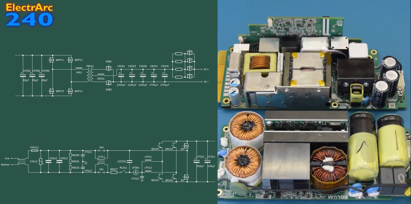 The reverse-engineered schematic shows it using an interleaved totem-pole PFC design with 600 V-rated TI LMG3422 600V GaN FETs in the power stages. After the PFC section we find a phase-shifted full bridge rectifier with OnSemi’s SiC UF3C065030K4S Power N-Channel JFETs.