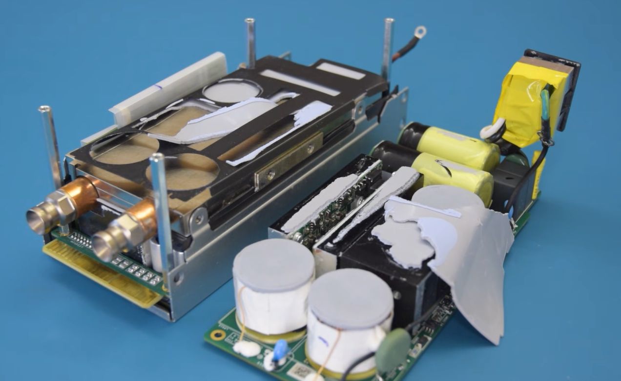 Recently [ElecrArc240] got his paws on an Intel-branded 3 kW power supply that apparently had been designed as a reference PSU for servers. At 3 kW in such a compact package air cooling would be rather challenging, so it has a big water block sandwiched between the two beefy PCBs. In the full teardown and analysis video of the PSU we can see the many design decisions made to optimize efficiency and minimize losses to hit its 80 Plus Platinum rating.