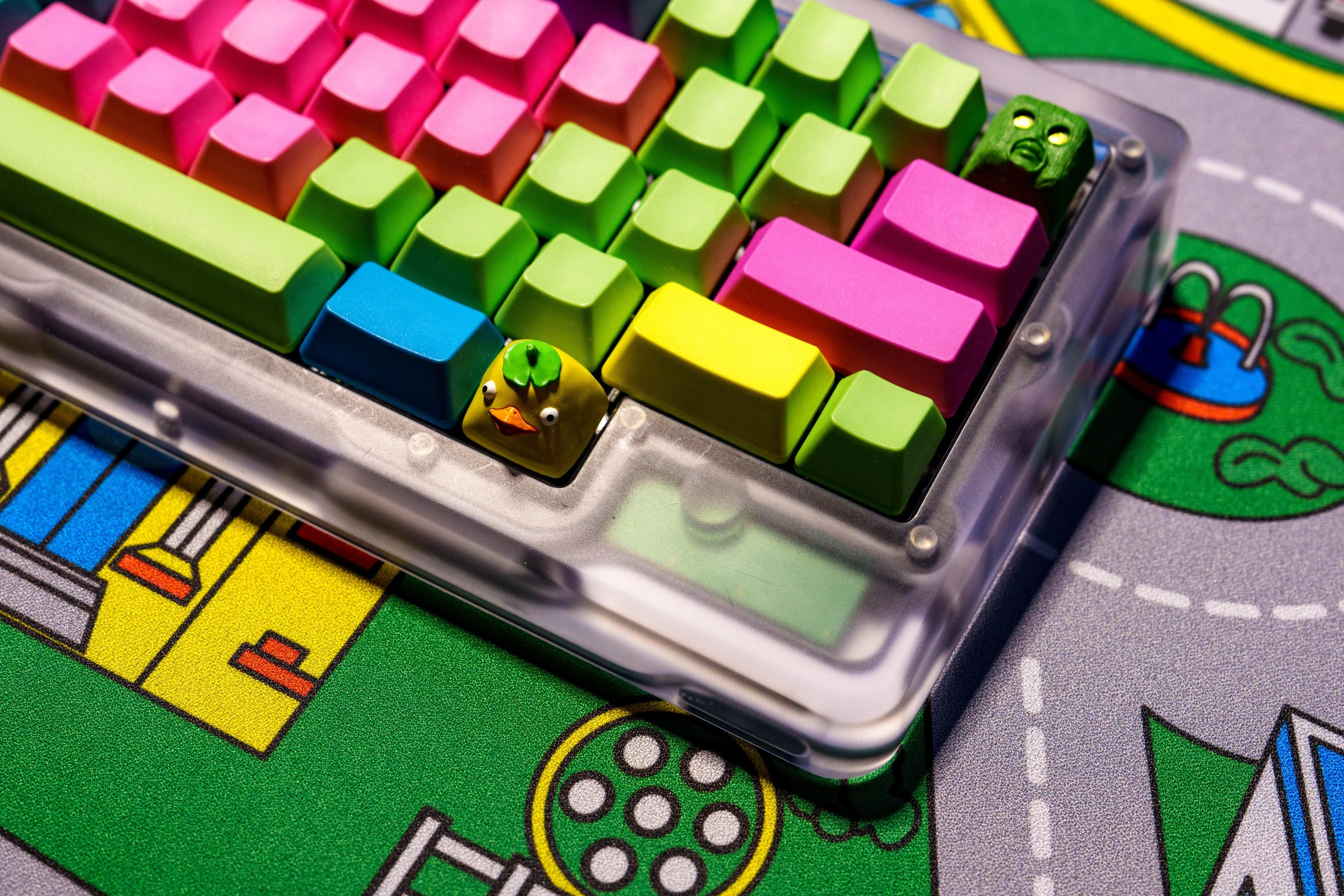 As for the keyboard, that’s a Norbauer Heavy Grail Ghost of Christmas Future edition, which was of course a limited release that’s long sold out. I’m sure there are other transparent bodies out there, but good luck finding a bug-eyed, duck-faced keycap.
