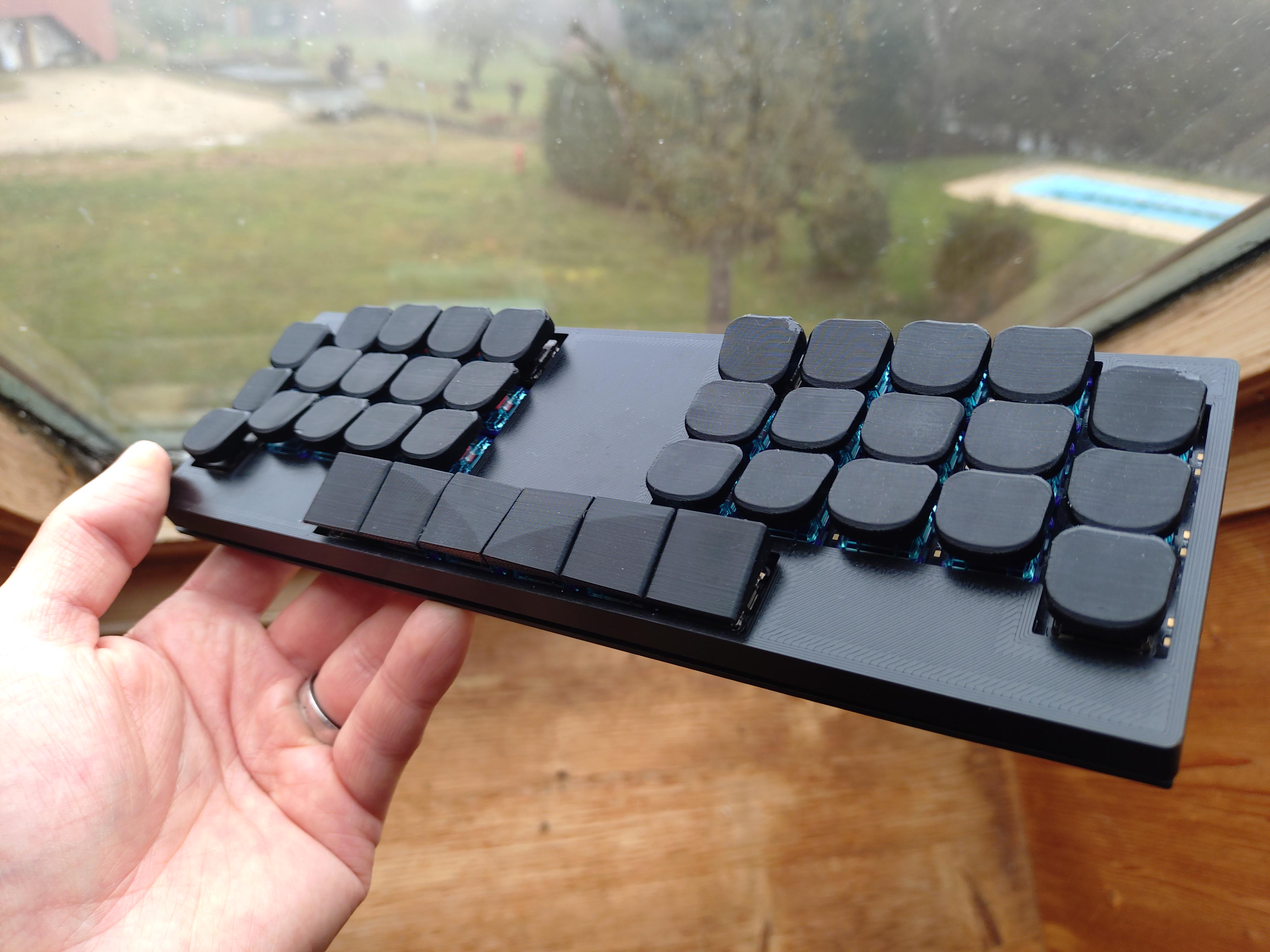 Regarding those thumb keys, [Blind_Heim] says that they wanted something ergonomic and monoblock at first, and so the angles were just for looks. But after using it, he realized they were actually quite useful when it comes to determining which key is which without having to look.