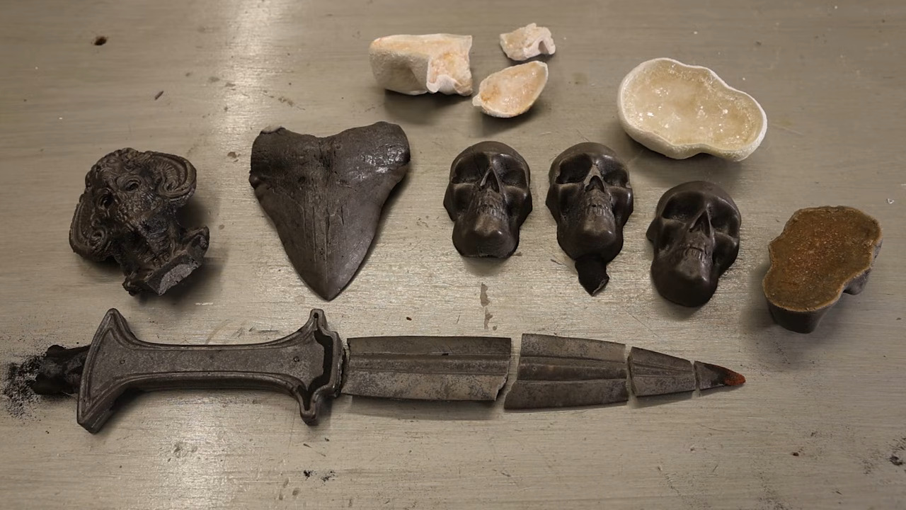 On the other hand, the sand reacts with the salt in some way– molten salt isn’t exactly a noble gas, after all–to create a lovely gunmetal finish to the parts. They almost look like metal, though the brittleness gives away the game when he opens the mold to show a dagger in several pieces. For the decorative busts and megalodon teeth in the test, though, it is a great success.