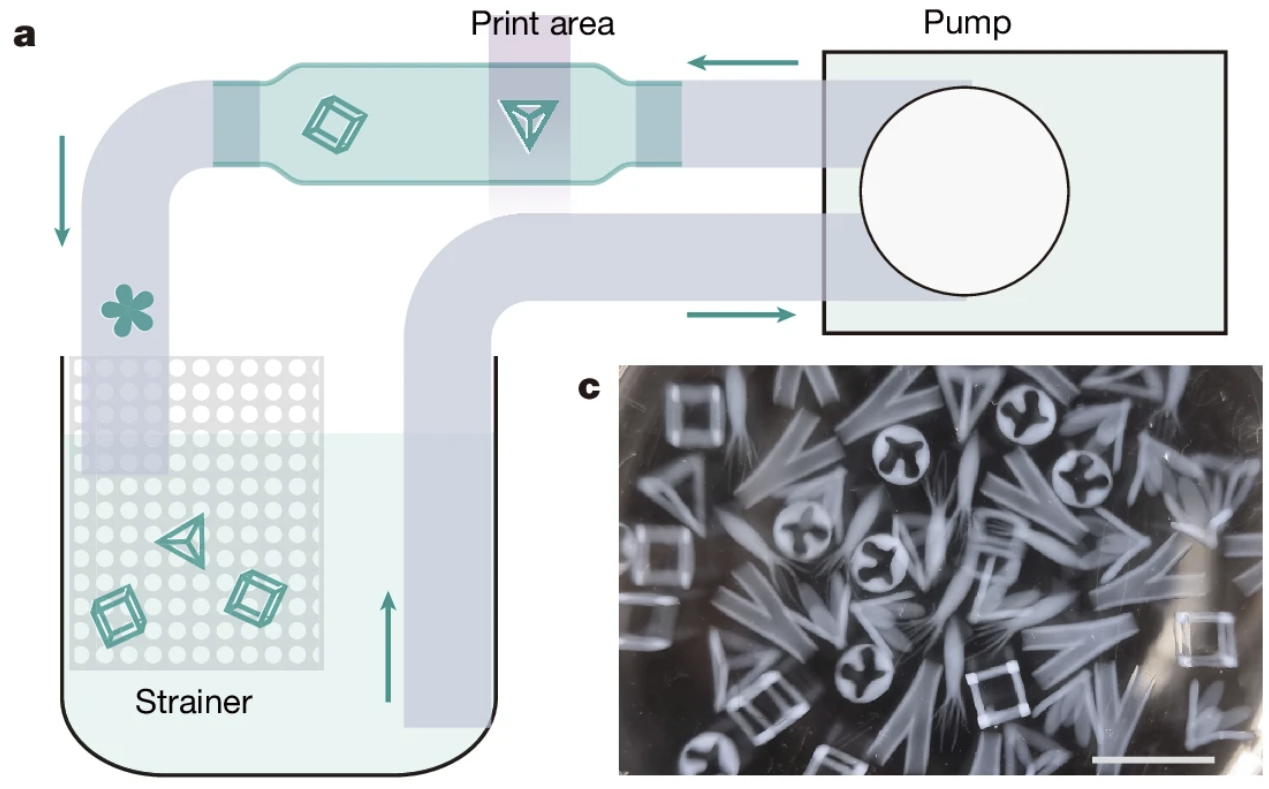 Why would you want to pump around liquid? Scalability of course! Printing in seconds while pumping the results into a collection vessel would allow for mass production more flexible than traditional ejection methods. The researchers manage to keep quality high with some fancy algorithmic correction, which allows for accuracy on the scale of μm.