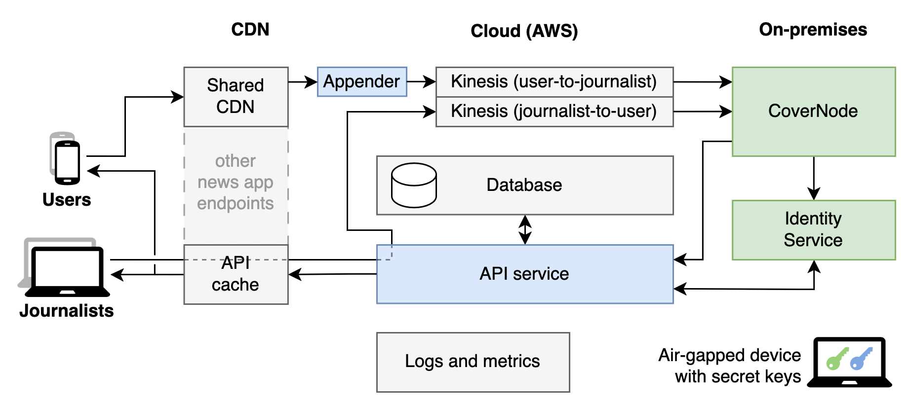 That is, unless somebody has a message to send to a journalist. In that case, the message and the source’s public key is encrypted with the journalist’s public key, packaged up, and sent in such a way that it appears fundamentally no different to any other garbage message that is being sent to the CoverDrop servers. Both real and cover messages are encrypted the same way and have the same length, and are sent at the same times, so anyone monitoring network traffic won’t be able to tell the difference.