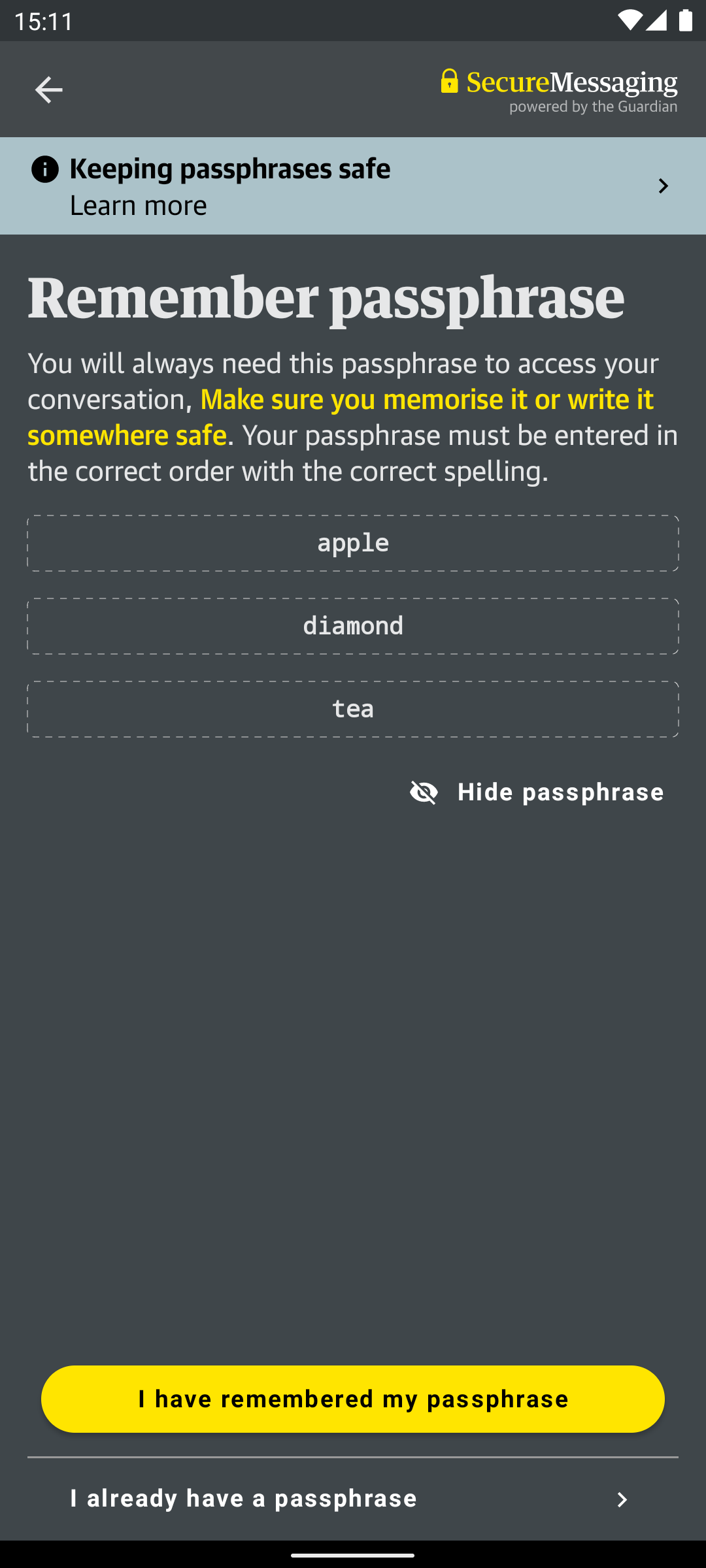 As for on-device security, the system is designed to be as unrevealing as possible as to whether it has been used for secure messaging or not. Message storage vaults used by the app are encrypted, maintained at a regular size, and are routinely modified at regular periods whether covert messages are being sent or not. Unless the decryption passphrase is known, there is no obvious evidence that the app has been used to send any messages at all.