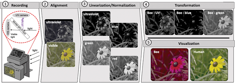 Of course, this would be easy if you were thinking about dogs or cats. They can’t see the difference between red and green, making them effectively colorblind by human standards. Researchers are using modified commercial cameras and sophisticated video processing to produce images that sense blue, green, red, and UV light. Then they modify the image based on knowledge of different animal photoreceptors.