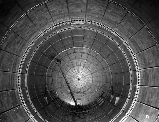 There is a film of the ship being built, and it’s rather fascinating. The strips of alclad are rolled into conical sections and riveted together, with a bituminous material serving as sealant. Even today, you would not want to weld this material, so instead three and a half million 0.035” (0.89 mm) rivets hold the plates together. A special automated riveting machine was invented for the construction of the metalclad airship, which “sewed” three rows simultaneously at a rate of five thousand rivets per hour.