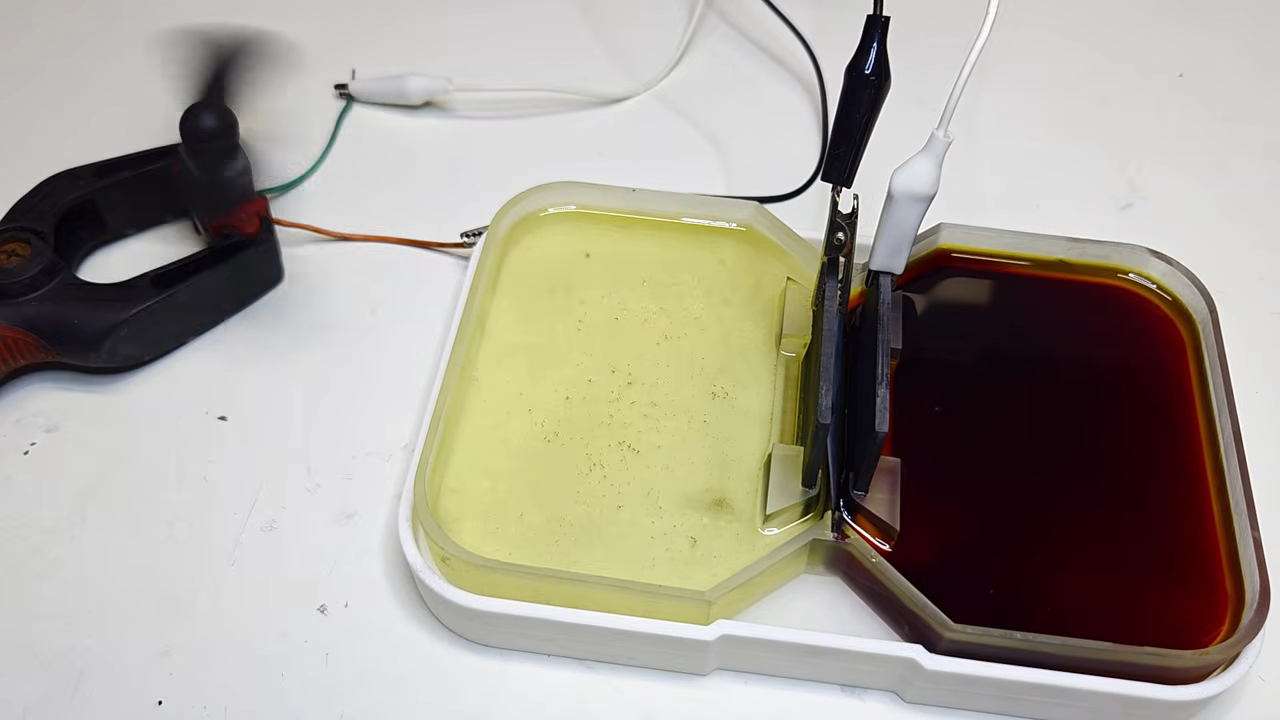 [Dusan]’s build is a zinc-iodide flow battery. It uses two 3D printed reservoirs, each holding a ZnI2 solution and a graphite electrode. Unlike traditional flow batteries, there is no mechanism included to mechanically push the fluid around. Instead, fluid motion is generated by the magnetohydrodynamic effect, which you may know from that Japanese boat that didn’t work very well.