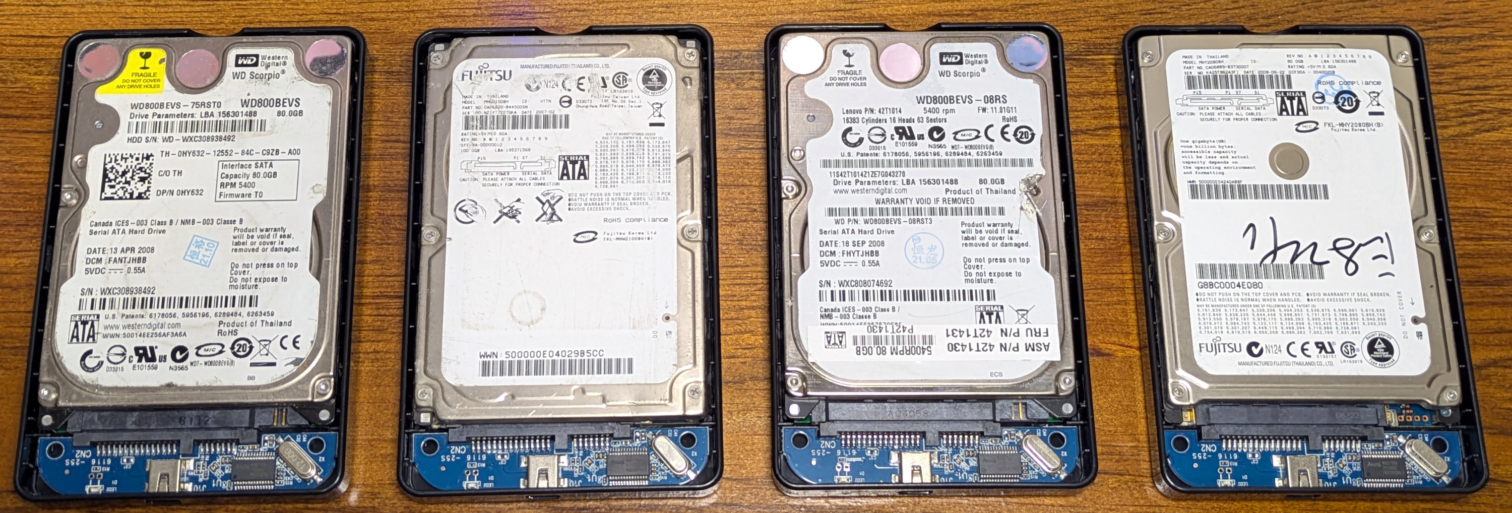 Right off the bat, it’s worth noting that no two drives are actually the same. Two are Western Digital and two are Fujitsu, but none of them have the same model number. The keen-eyed reader will also note that one of the drives is 100 GB, but it has been partitioned to 80 GB to match the others.