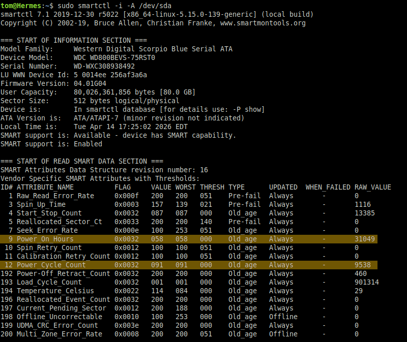 Fortunately, we can easily find out this information through Self-Monitoring, Analysis, and Reporting Technology (SMART). Using the smartctl tool, we can get a readout of all the drive’s SMART parameters and figure out what we’re dealing with: