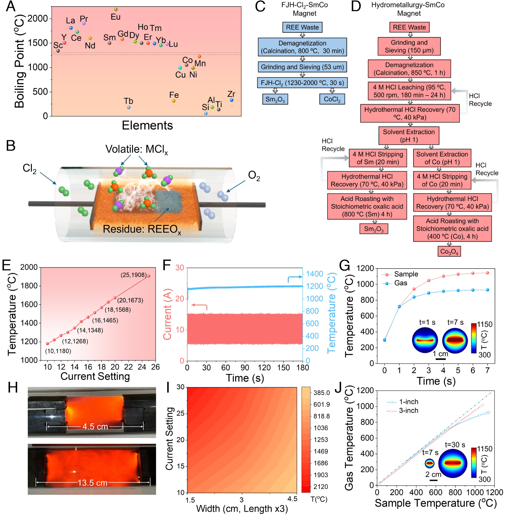 In this case, the high-energy discharge is applied to waste magnet material in an effort to vaporize the non-rare earth components that are present. The discharge is performed in the presence of chlorine gas, which would chlorinate materials like iron and cobalt in the sample, removing the volatile elements and leaving the rare earth elements behind in solid form. Laboratory experiments were able to refine the material to 90% purity in a single step.