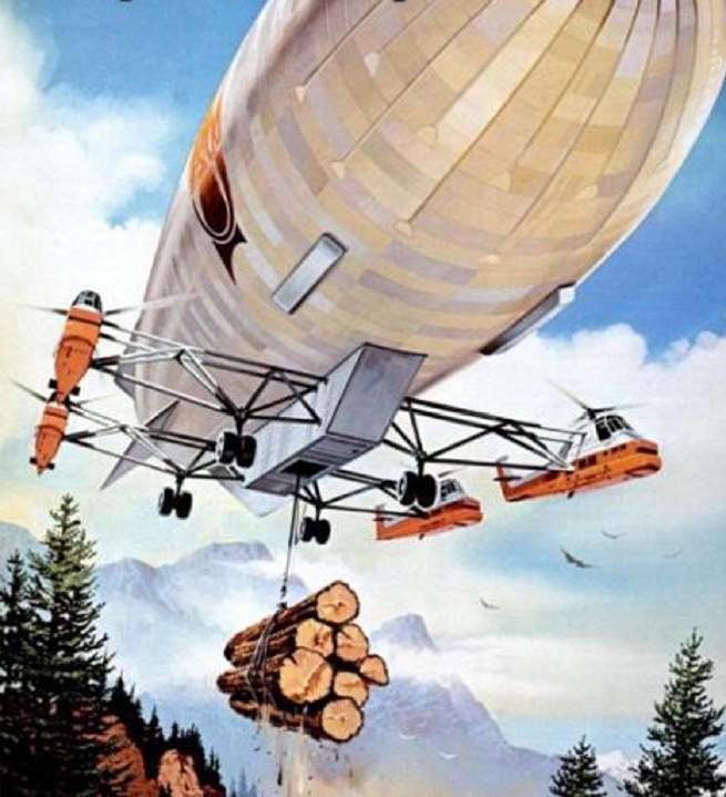 The idea isn’t crazy– by 1979, helicopter logging was a proven concept, limited largely by the lift capacity of existing helicopters. Most of the old-growth timber in the USA was, even by that point, located in the mountain west where building logging roads is prohibitively expensive or downright unsafe. Helicopters are, of course, thirsty beasts when lifting large loads. The hope was that the Helistat would be far more fuel-efficient and pay for itself thereby.