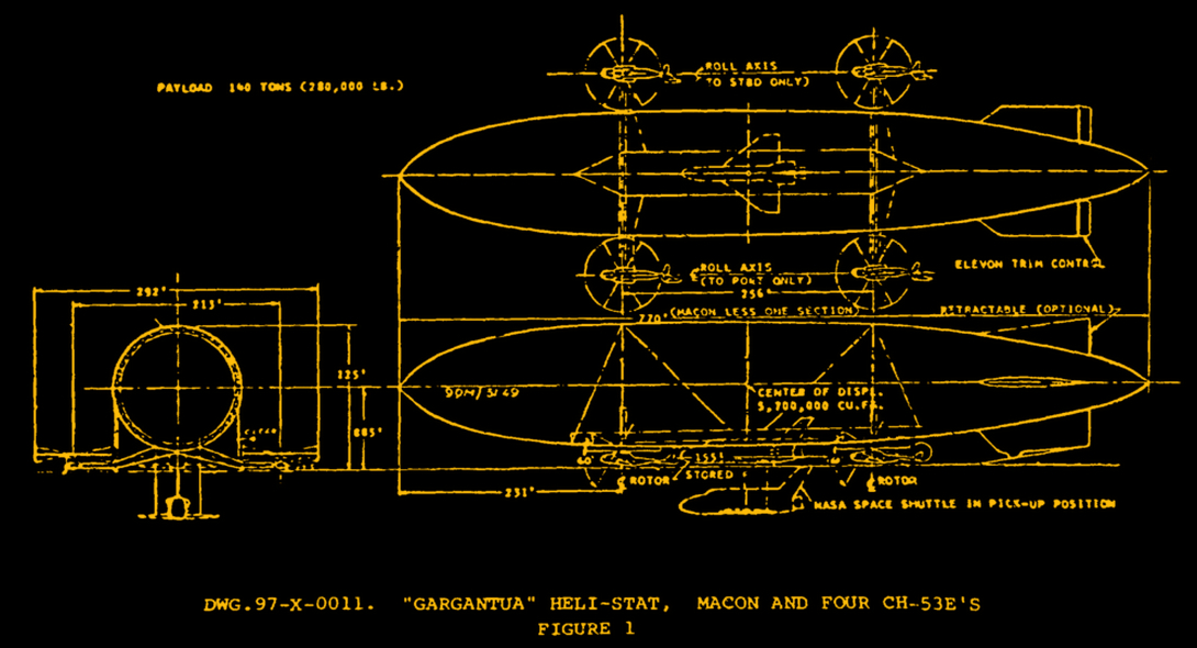 The Piasecki corporation proposed two variants of the concept in 1975: a smaller 75-ton version, designated project X-97-0004, and the X-97-0011 “Gargantua” which was actually pitched to NASA for the Shuttle Carrier Aircraft project. “Gargantua” would have used four CH-53E “Super Stallion” heavy-lift helicopters with a gas bag just slightly smaller than the USS Macon– indeed, internal documents have the caption “four CH-53 and Macon”. In spite of that caption, it was actually shorter than the Macon by a full hull section.