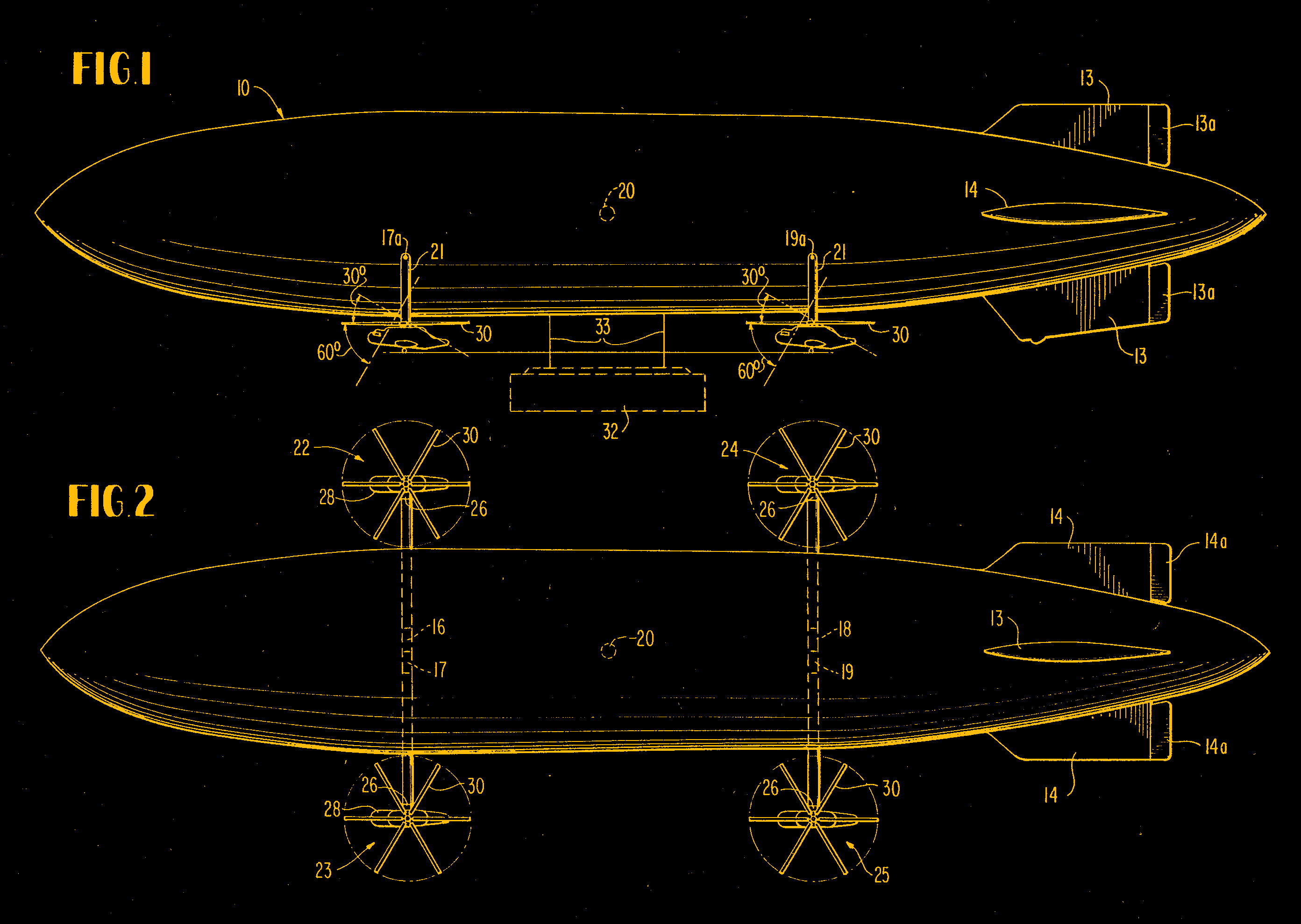 The gas bag is elongated and aerodynamically suited for higher-speed flight. Gone are the twin ‘flying banana’ copters; instead we see a quartet of gondolas with helicopter-type rotors. Notably the patent specifies “two or more”– but it’s the quadcopter configuration that appears in the figures of the patent and was ultimately built. These rotors are to provide propulsion and direction to the craft, as much as lift– that was to be handled by the gas bag, though like the long-lost Navy blimps the intention was to “fly heavy” and let much of the load be taken up by the rotors.