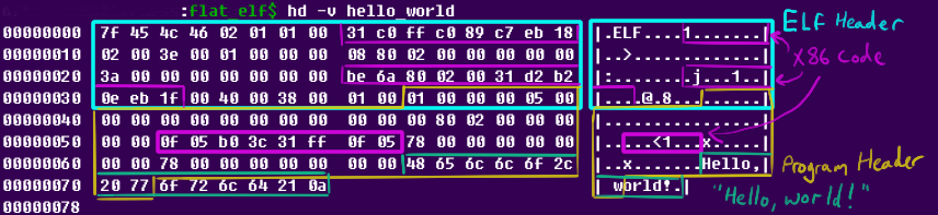 The first shenanigans are extreme code size optimizations: by selecting instructions carefully (and in a way a C compiler never would), he shaves another 16 bytes off. But the real shenanigans begin when he starts looking for spaces in the ELF header that he can clobber while the program is still accepted by Linux: now he can move his already tiny x86_64 code into these “vacant” spaces in the ELF and program headers for a final tiny ELF file weighing in at just 120 bytes.