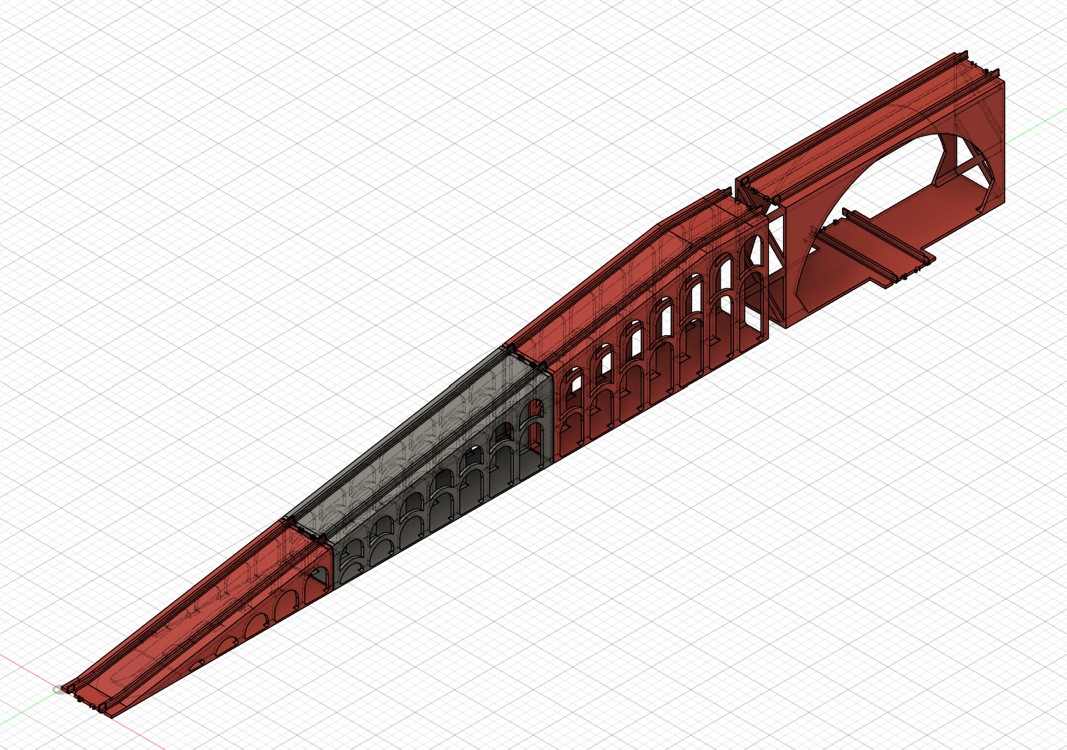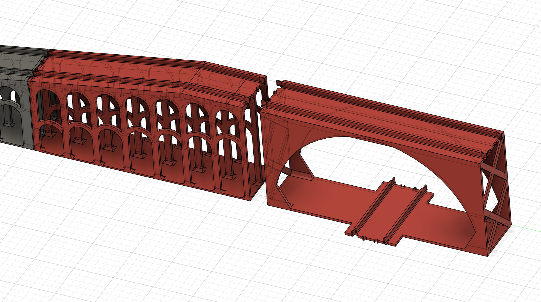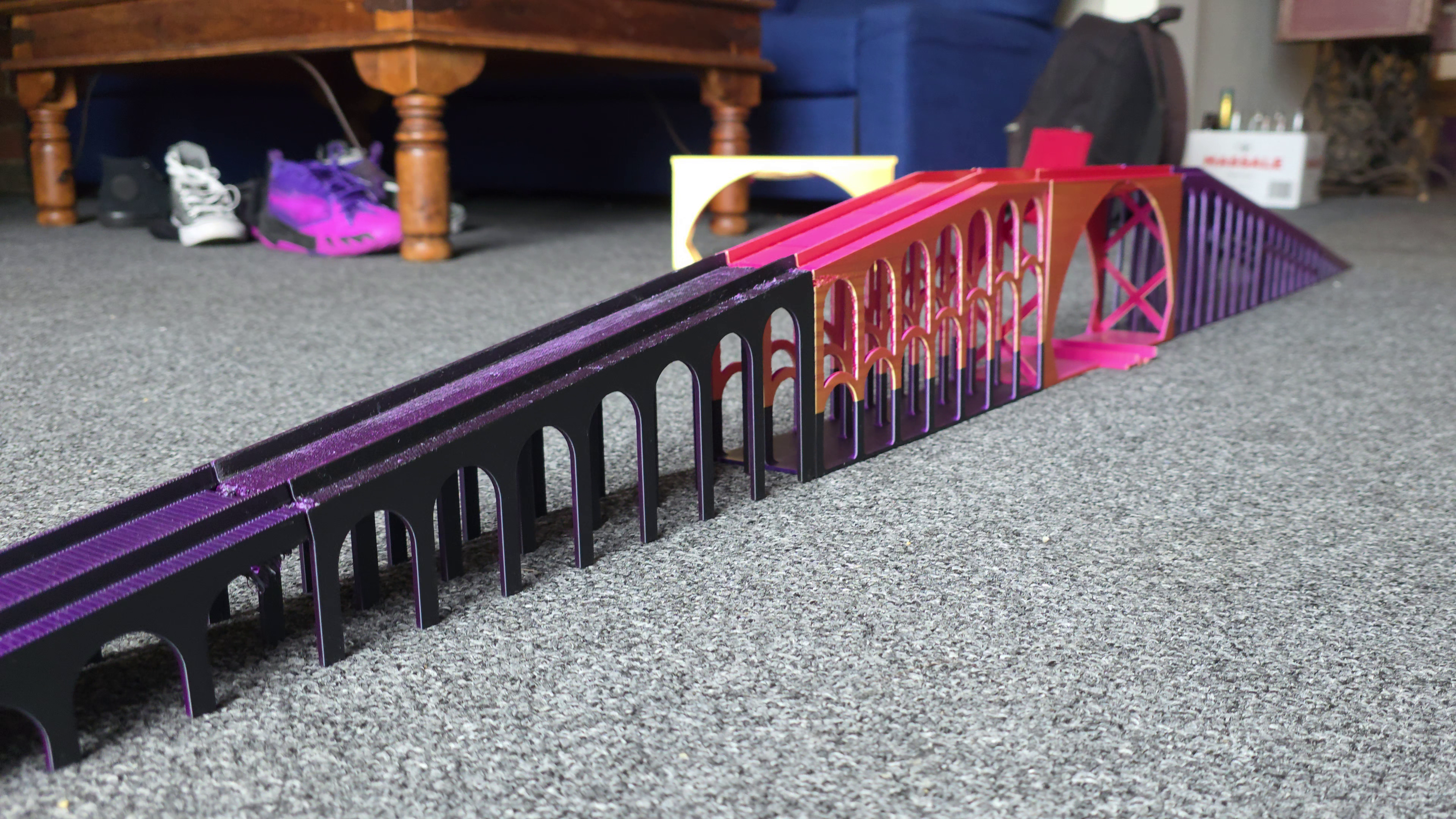 With that said, one might argue that the excessive amount of arches and pillars used in my design might have wasted more plastic than just using standard supports generated by the slicer. Regardless, I think the choice to go with arches gave the bridge a nice aesthetic befitting a good railway. I printed the bridge pieces in PLA at a layer height of 0.20 mm, using two-colored filament just because I could, and it was cheap at the store. While some of the diagonal stretches of the rails featured obvious layer lines, this didn’t seem to have any negative effect on performance. It did, however, give the trains a zippy sound when they climbed and descended the bridge.