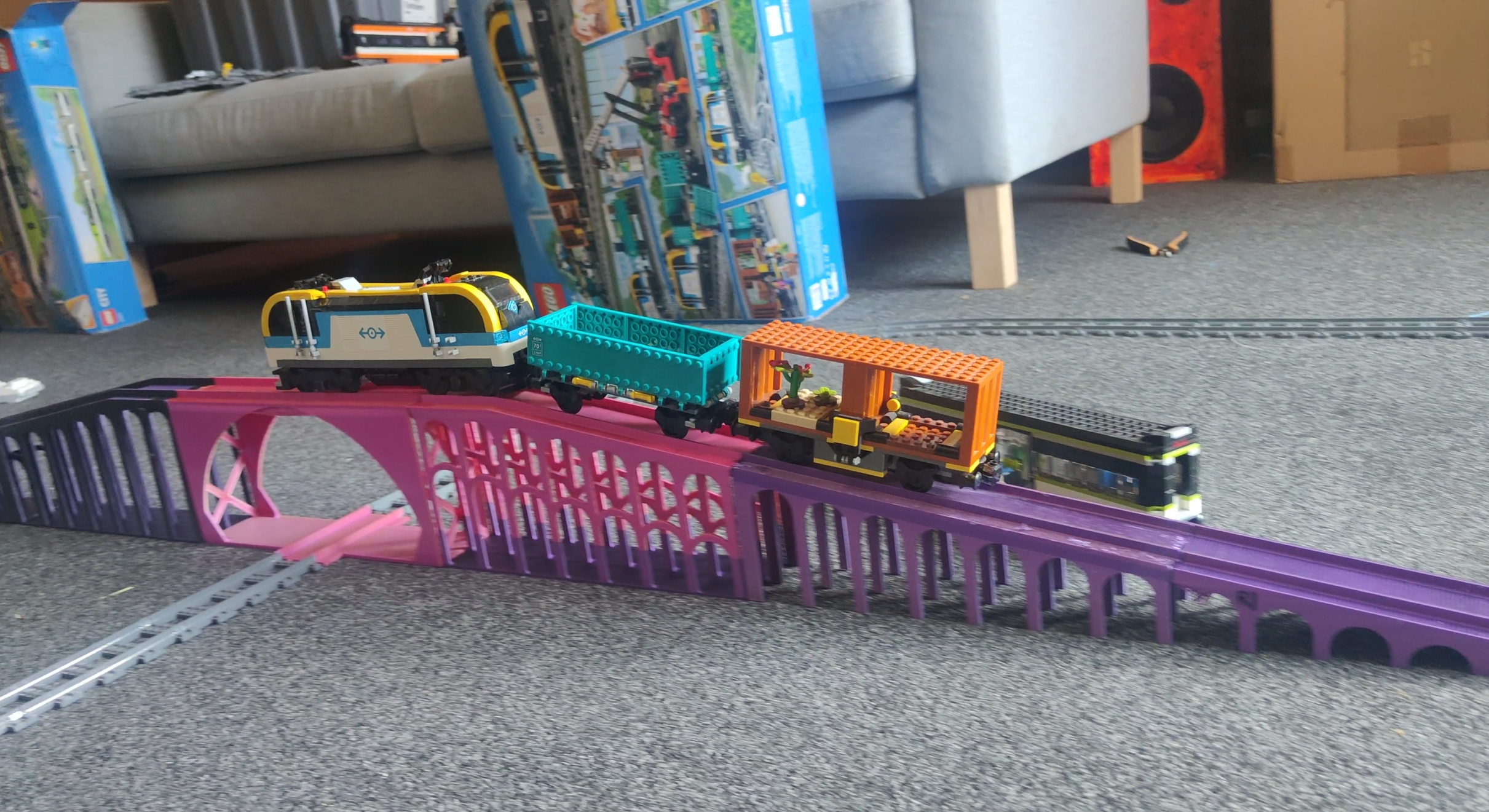 We also soon found issues with carriages. Even at a subtle 10-degree grade, most Lego locomotives struggled to pull more than a single carriage up the slope. Further compounding the problem was that the momentum from the extra carriages on the downhill tended to overspeed the train and derail it at an immediately-following turn. Some carriages and locomotives were also simply incompatible with the bridge due to my design decisions. I had not paid much attention to the transitions on and off the sloped ramps. This meant that some longer carriages with wider-spread bogies would find themselves derailing as one set of wheels left the track while passing over the bridge. There were also some minor issues with the bridge pieces themselves and how they couple together. The Lego track coupling design is pretty good at snapping pieces together when they’re injection molded. It doesn’t work as well with softer 3D-printed PLA, nor is it good at locking together big heavy pieces of bridge that weigh many hundreds of grams each.